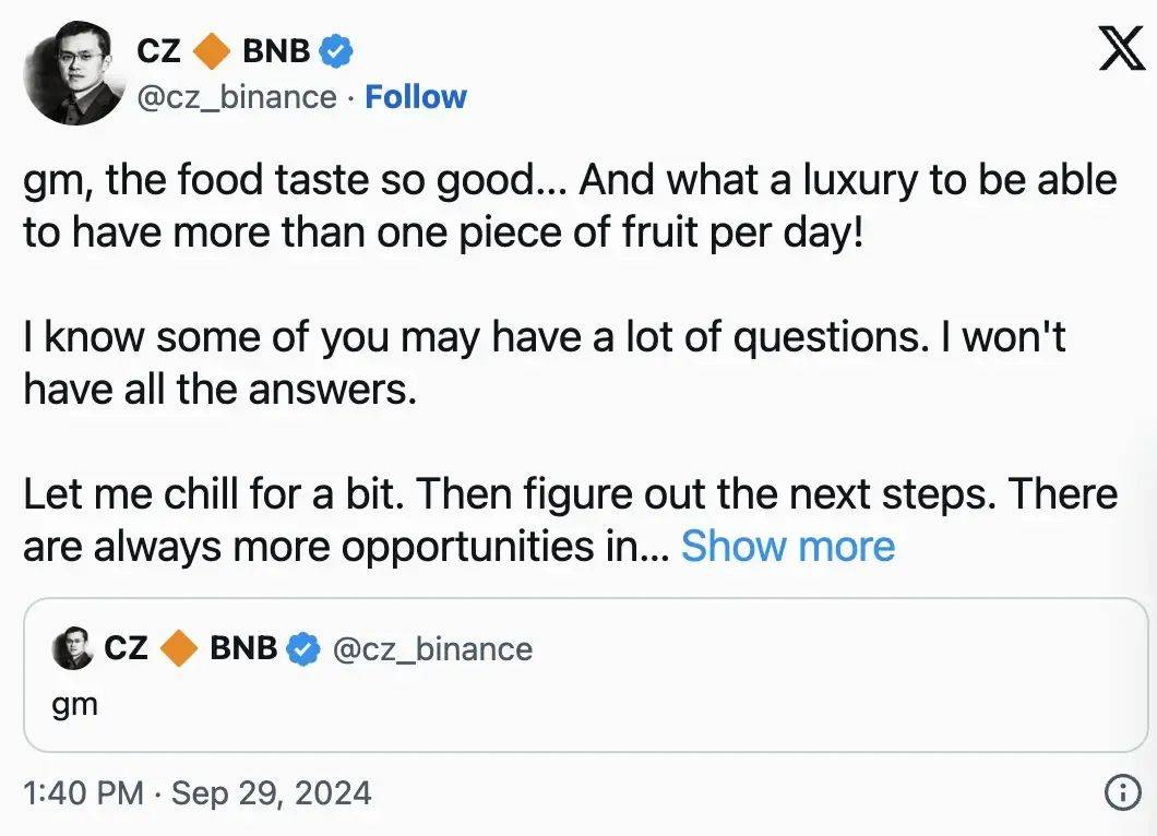 北京时间9月30日,币安创始人赵长鹏周末在刑满释放后首次公开表态。他在X上公布了自己的下一步动向,承诺会继续投资区块链领域、人工智能和生物技术。