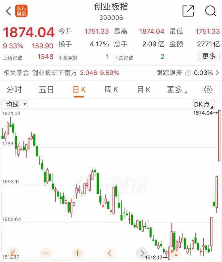 资金做多情绪彻底爆发,今日早盘,A股全线反攻,截至午间收盘,创业板指暴涨9.33%,创历史最大盘中涨幅;沪指涨2.14%,深成指涨6.37%。新能源、大金融、大消费集体爆发,东方财富暴涨超13%,宁德时代大涨近10%。