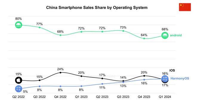 不过,在中国市场,鸿蒙系统的份额已超过iOS。2024年第一季度,安卓市场份额68%;HarmonyOS超过苹果iOS,以17%的份额位列第二;iOS份额则环比下降4个百分点至16%。