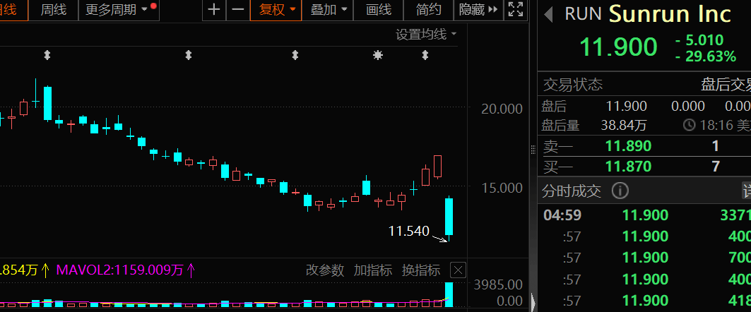光伏太阳能板块集体大跌,SUNRUN盘中最高跌超30%,收盘跌29.63%,阿特斯太阳能跌19.9%,Enphase Energy、第一太阳能、晶科能源跌10%以上。