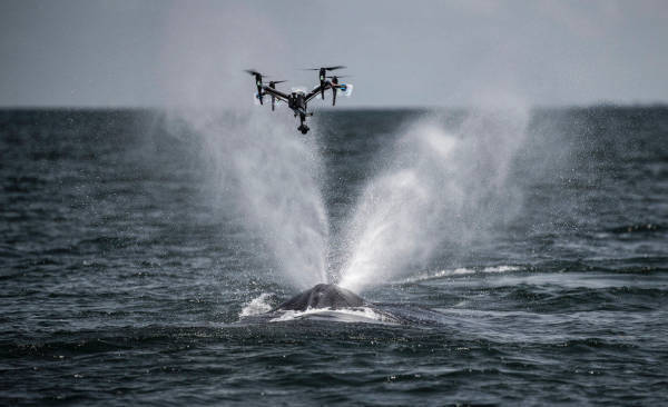 “海洋联盟”数年前发起了一项名为“Snotbot”的项目,将无人机送往鲸鱼出没的海面,在它们跃出水面呼气时,采集从其体内喷射出的水柱作为研究样本,分析其中丰富的生物数据:DNA、激素和大量微生物。大疆无人机在项目中发挥了重要作用。