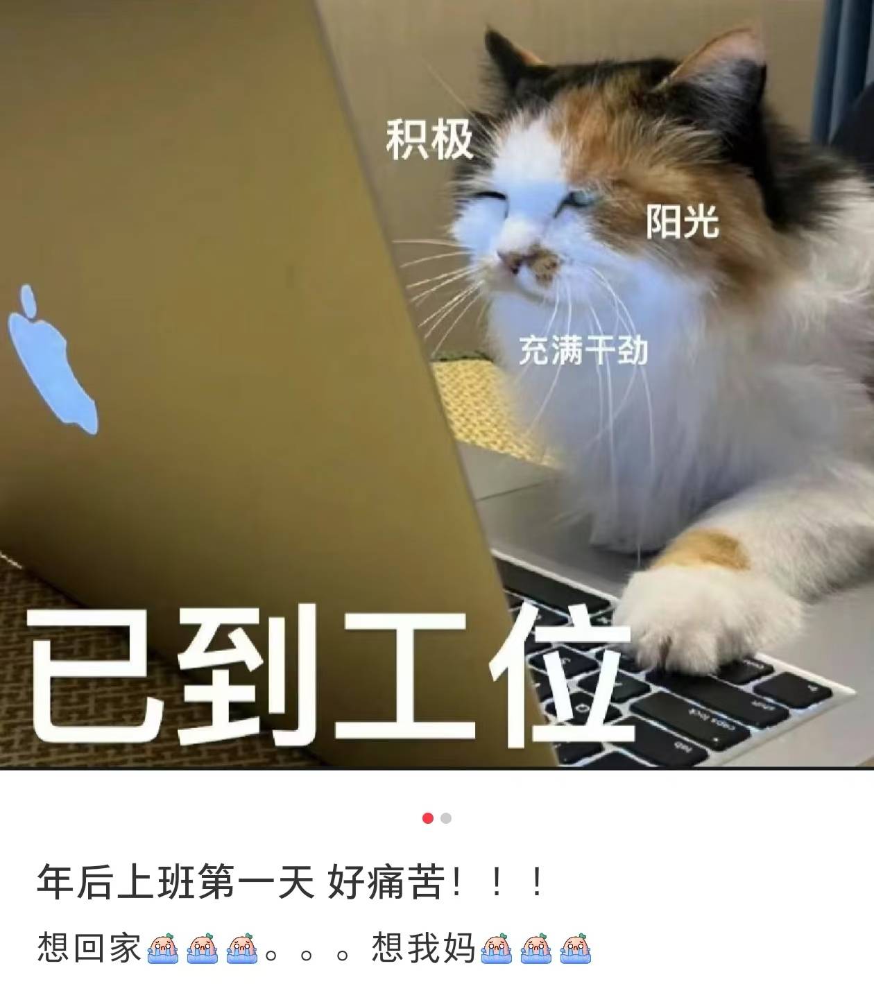 一位浙江网友复工第一天的心思非常简单明了:想回家,想我妈。配图虽然写着积极、阳光、充满干劲,但困到眯眼的小猫还是说明了网友的真实情绪。