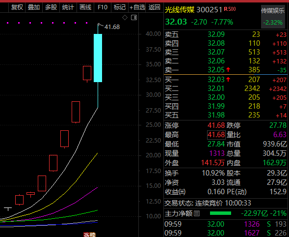 刚刚,光线传媒罕见剧烈波动。集合竞价大幅高开后光线传媒短短1分钟即封上20cm涨停,不过短短1分钟左右时间该股即大幅跳水,4分钟左右时间即大跌,一度触及27.84元/股,跌幅接近20%,几乎上演20cm天地板。以最低价到最高价跌幅来看,在短短几分钟时间该股跳水幅度达到惊人的33%。截至发稿,该股成交额已超百亿元,再创历史新高。