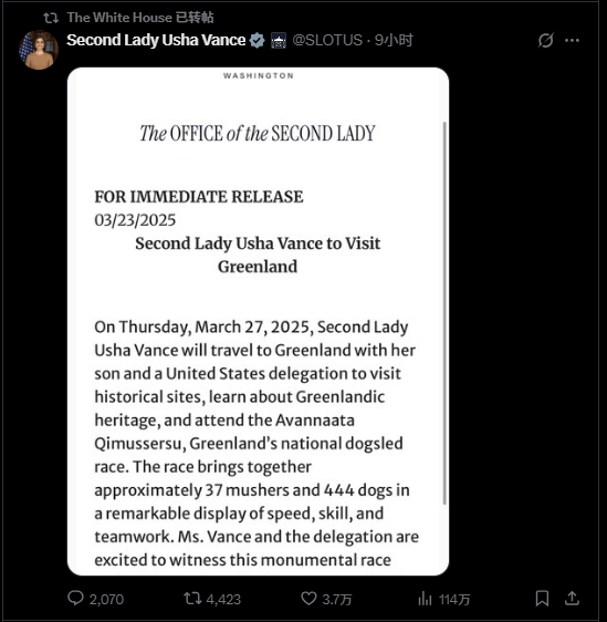 白宫表示:“万斯女士和代表团很高兴见证这场具有纪念意义的比赛,并庆祝格陵兰的文化和团结。”据悉,乌莎·万斯和代表团将于周六返回美国。