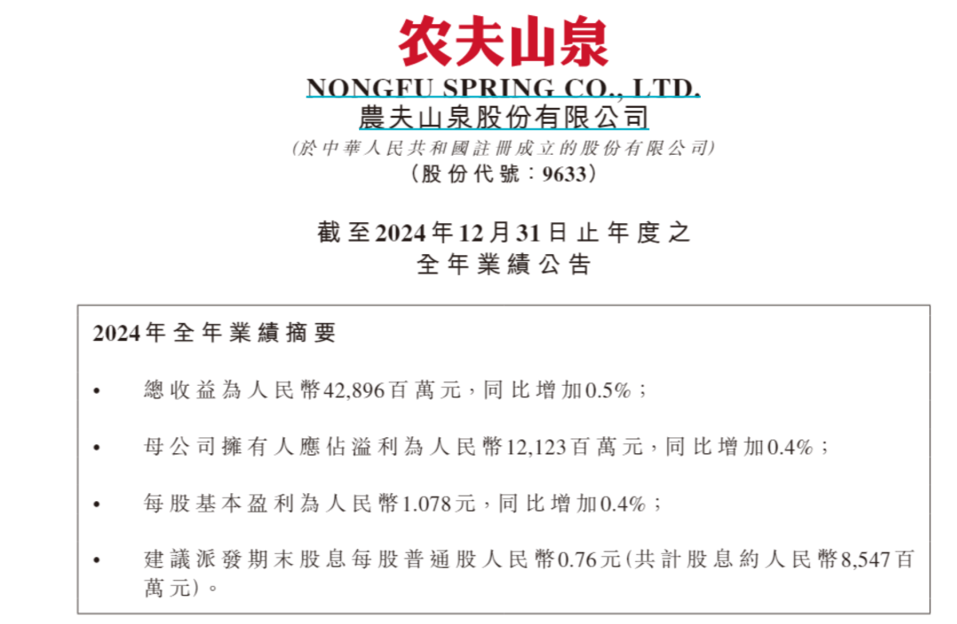 农夫山泉2024年营收和净利润增速大幅放缓。