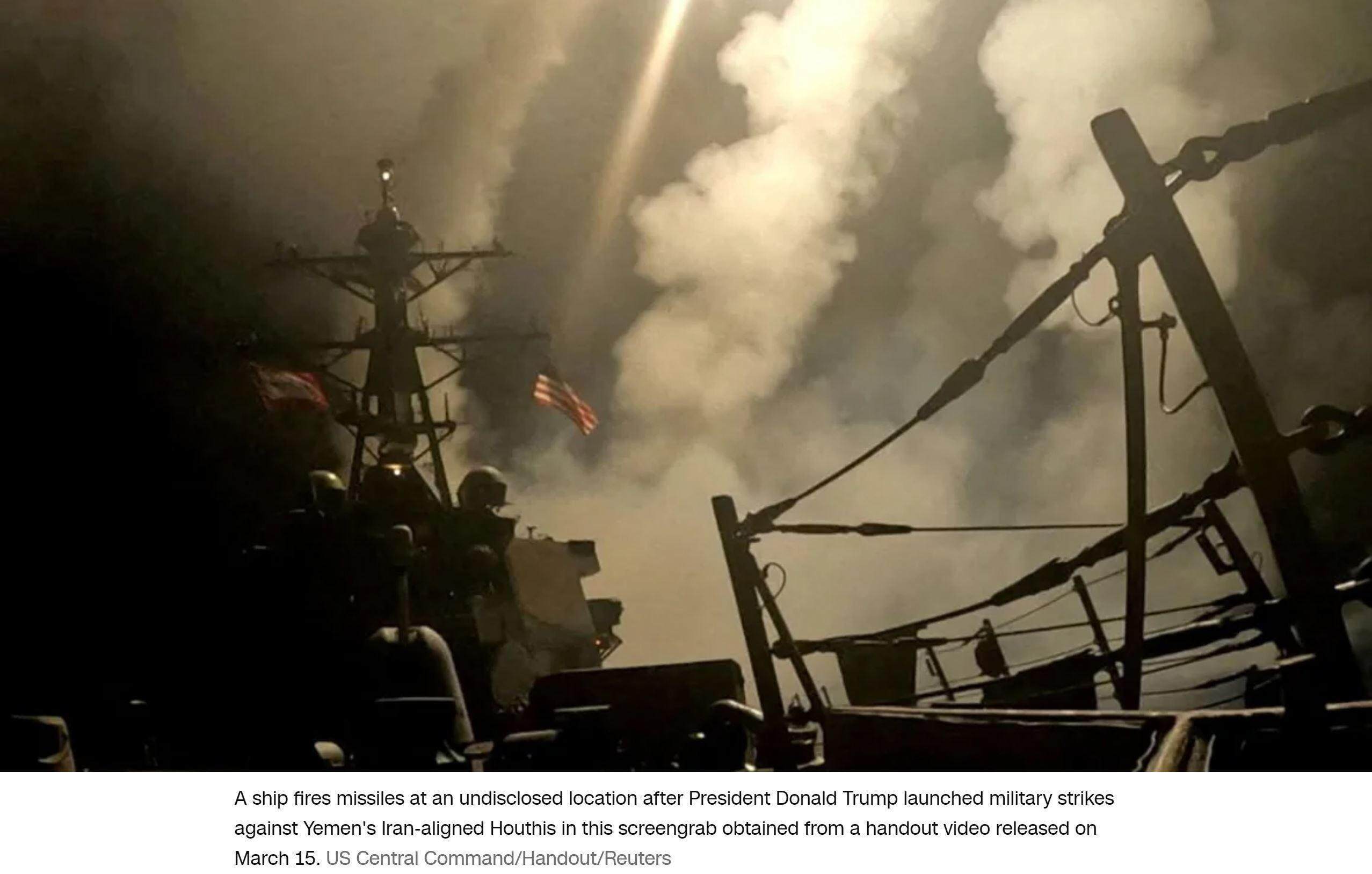 △美国有线电视新闻网报道:美军中央司令部3月15日发布的视频显示,美国总统特朗普当天宣布对也门胡塞武装发动军事打击后,一艘美军军舰发射导弹。