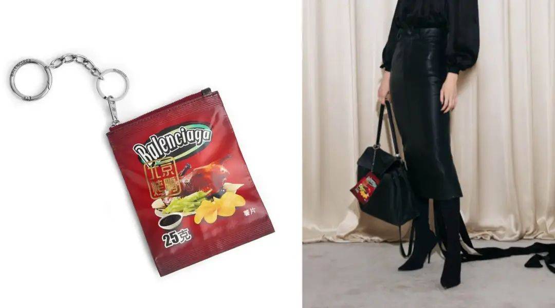 最近,巴黎世家推出的一款“北京烤鸭包”也颇受关注。从网友分享的视频来看,这款包整体像个薯片包装袋,上方封口处有拉链,正面印着大大的“北京烤鸭”四个字,下面也真的画了一只烤鸭,左下角还有“150克”的字样,反面还有营养成分表。