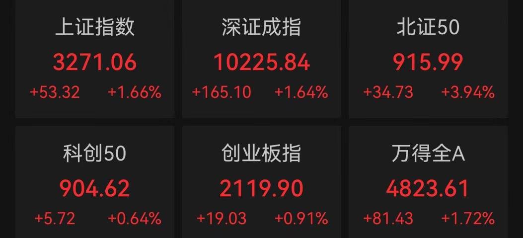 截至午盘,上证指数涨1.66%,报3271.06点;深证成指涨1.64%,报10225.84点;创业板指涨0.91%,报2119.90点。