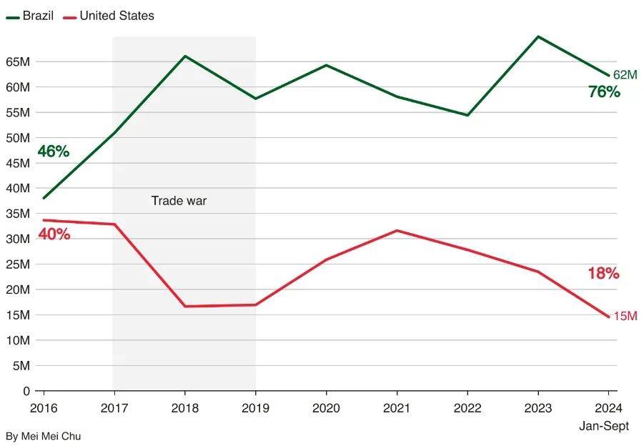 路透社此前引述中国海关数据称,2024年中国从美国进口的大豆份额已经从2016年的40%降至18%,而巴西进口所占的份额从46%增至76%;玉米进口情况亦然。