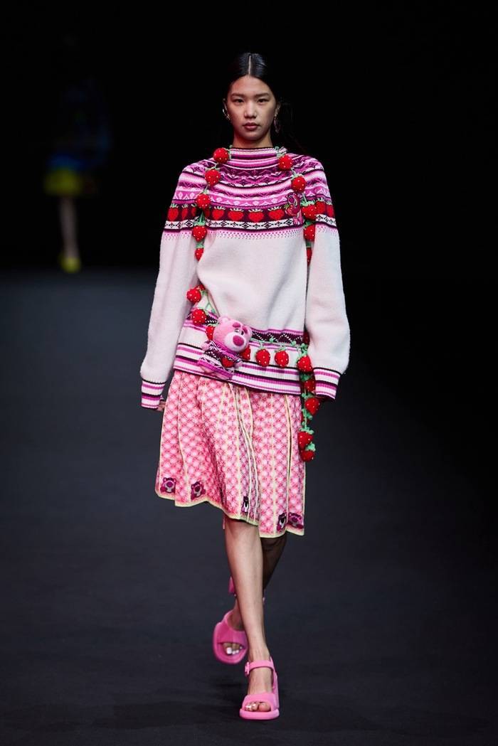 大秀分为四大篇章——“冒险的起点”“未知的挑战”“梦想的飞行”与“友谊的陪伴”,每一段都如同一次风格变奏:解构与重组、柔软与锋锐、复古与未来并置共存。从玩偶结构中提取廓形线条,以针织、串珠、亮片等多样材质表达玩具的质感世界;色彩灵感源于动画原色,拼接、撞色、套染大胆前卫,像是童年记忆的调色板在T台上被重新激活。