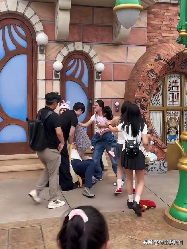 视频里的画面令人揪心:在迪士尼疯狂动物城园区,一对年轻情侣与一家三口的肢体冲突激烈展开。白衣男子(小女孩父亲)被情侣中的男性牵制住,双方扭打在一起;抱着小女孩的母亲一手护娃一手劝架,却目睹戴玲娜贝儿帽子的年轻女子突然转身,一巴掌挥向怀中的孩子。小女孩的哭声、母亲的崩溃、父亲的失控,与迪士尼乐园的欢乐氛围形成刺目对比。